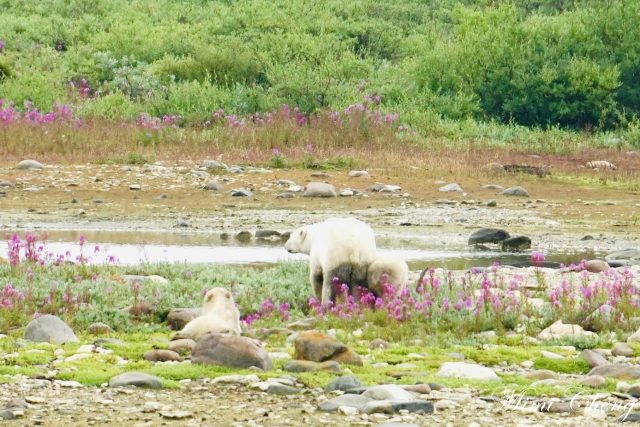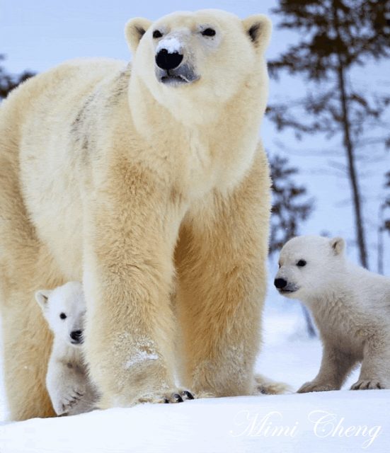 一頭母熊,帶著兩隻奶黃色的小熊,在苔原那頭出現了。