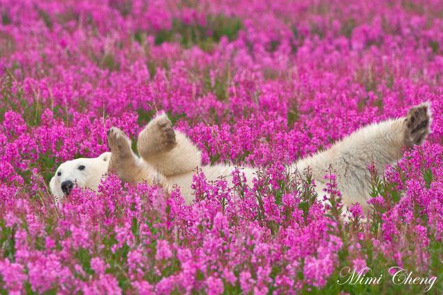 我們在車內喝著熱湯,窗外的小熊在粉紫色的花海中打滾——
