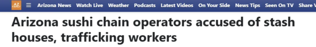 亞利桑那州一家壽司連鎖店的老闆和兩名經理因涉嫌窩藏非法移民並在東谷地區(East Valley)經營人口販運活動而被捕,聯邦當局對其提出了指控。