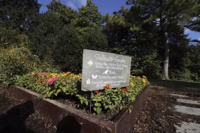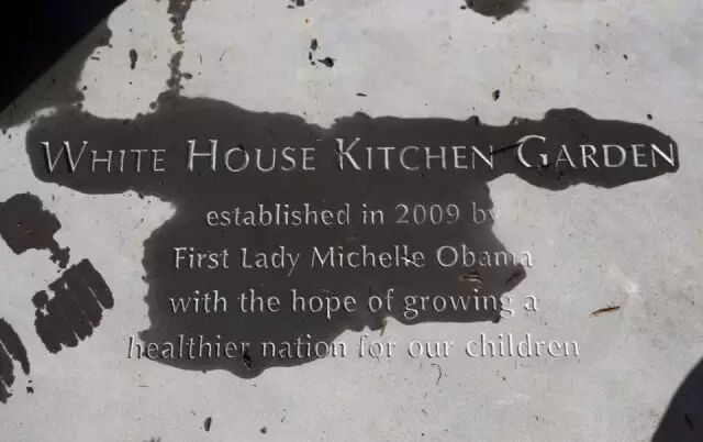 上面寫著:「白宮廚房花園,2009年由第一夫人米歇爾‧奧巴馬創立,希望為我們的孩子建立一個更健康的國家。」