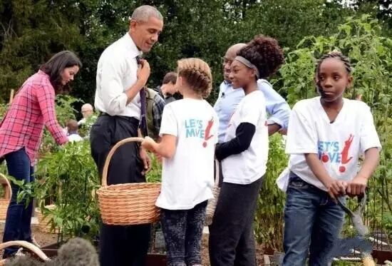 2016年10月6日,美國總統奧巴馬,與第一夫人米歇爾,帶領學生採摘白宮菜園裡的蔬菜,親自下地挖甘薯。