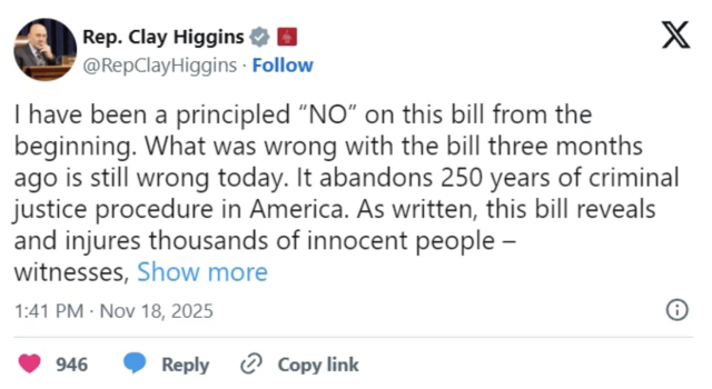 唯一投反對票的是路易斯安那州共和黨眾議員 Clay Higgins。