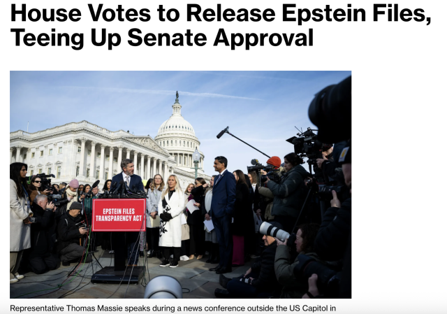 美國國會眾議院在 11 月 18 日以 427 票贊成、1 票反對 的壓倒性結果,通過了《愛潑斯坦檔案透明法》。這項法案要求司法部公開大量與傑弗里·愛潑斯坦(Jeffrey Epstein)相關的調查記錄。