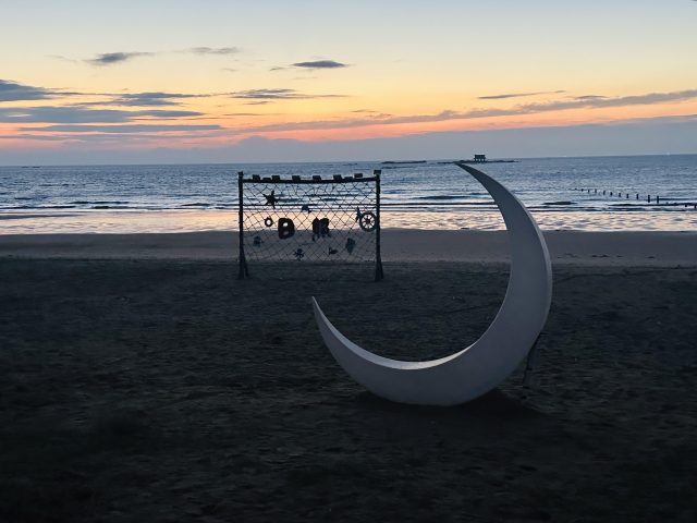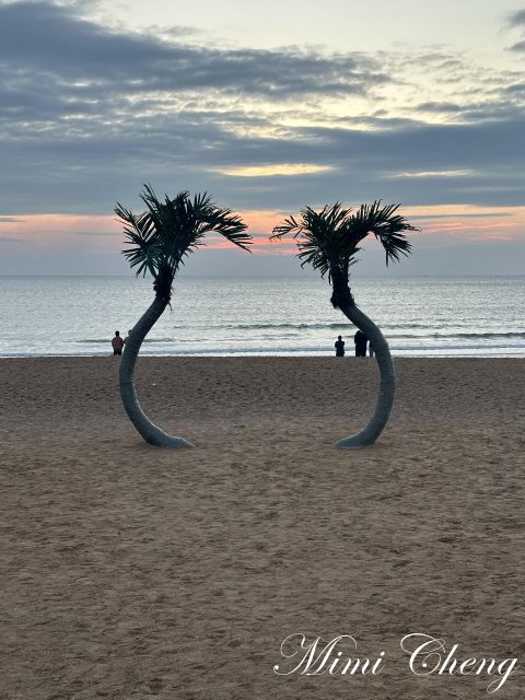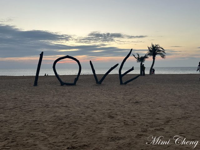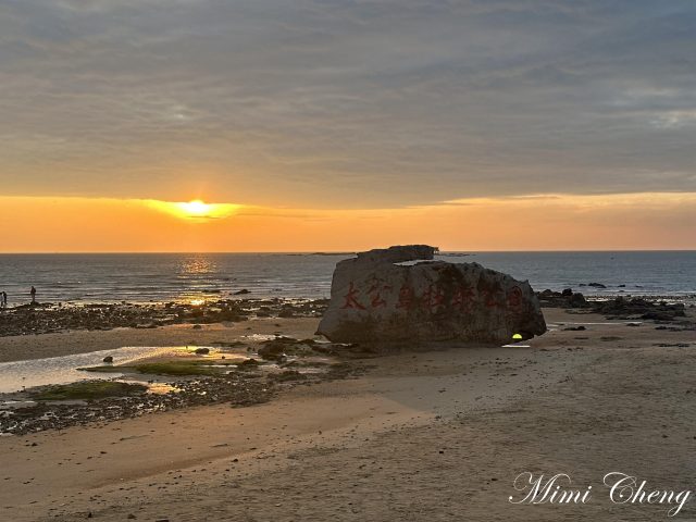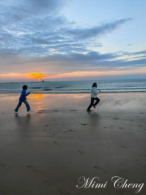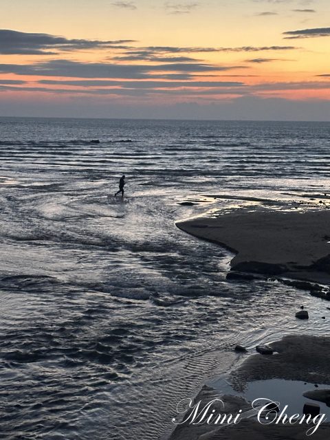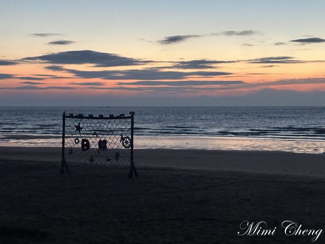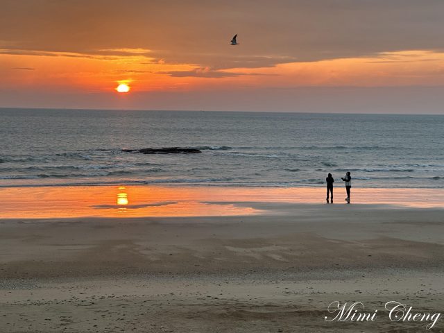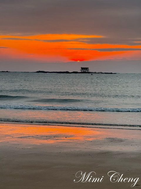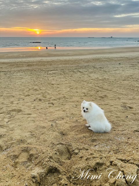 有趣的是,一隻小狗也端坐沙灘,與我共賞這絢爛時刻。