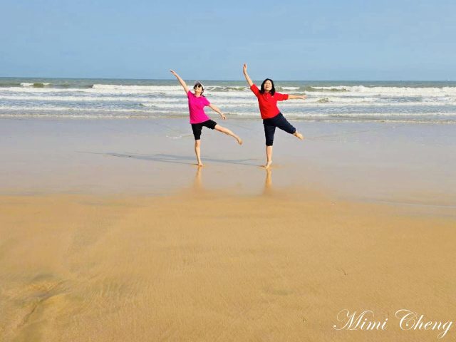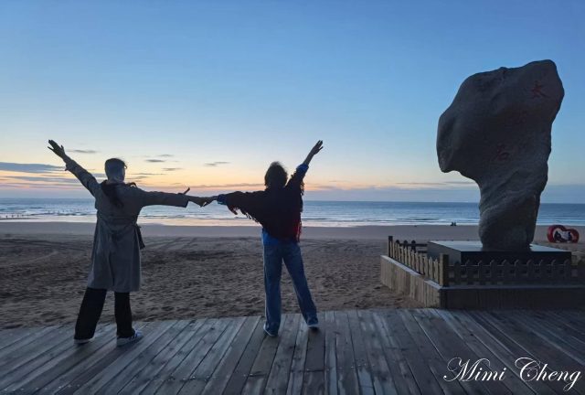 沿著木棧道漫步,一側是青翠的松林,一側是嶙峋的礁石群。潮水退去,礁石顯露出它粗獷的肌理;潮水湧來,浪花在礁石間綻放出雪白的詩句。同學們紛紛在礁石上留影,尤其是女生們,一個個輕舞飛揚,擺出各種姿態,彷彿回到了少年時光。