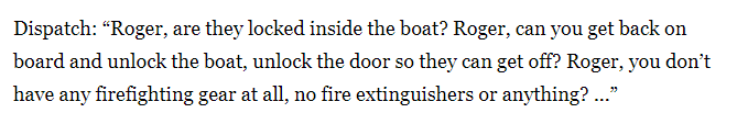 調度員:「收到。他們被鎖在船里嗎?你能重新回到船上,打開船鎖打開門,讓他們下船嗎?你沒有任何滅火裝備,沒有滅火器或其他東西嗎?」