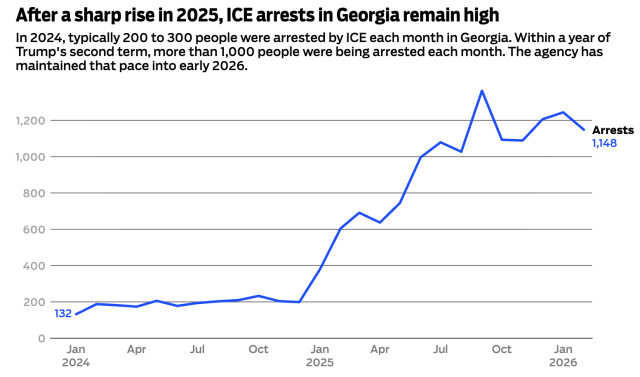 2026年2月,ICE在喬治亞州平均每天進行41起逮捕,比2025年2月的每天22起增加了85%以上。同期,喬治亞州ICE拘留設施的在押人數也從2025年2月的約2,800人增加到2026年2月的約3,300人。